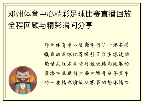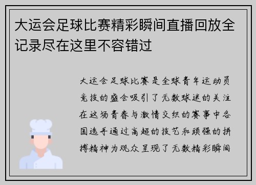 本文将围绕“鞍山足球比赛直播间精彩赛事回顾与实时互动评论平台”进行详细探讨。首先,我们将阐述该平台的功能特点,分析其在赛事直播中的重要性。接着,将从用户体验、实时评论互动、赛事回顾和社区文化四个方面深...